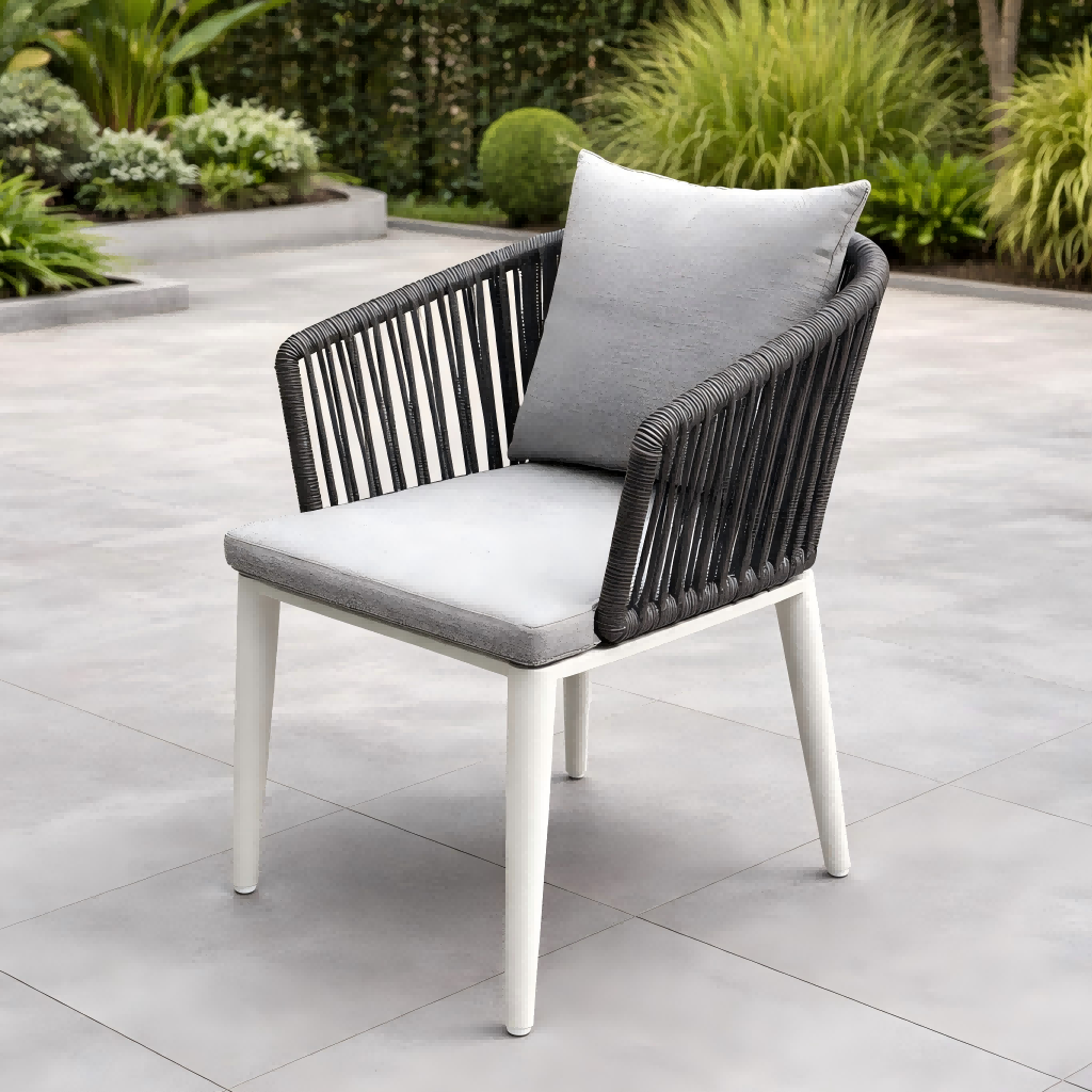 डाइनिङ कुर्सीहरूमा डोरीले बुनेको ब्याकरेस्ट हुन्छ, जसले आरामदायी समर्थन प्रदान गर्दा आधुनिक र सुरुचिपूर्ण उपस्थिति सिर्जना गर्दछ। फ्रेम पाउडर-लेपित एल्युमिनियमबाट बनेको छ, जसले खिया र बाहिरी मौसम अवस्थाहरूमा उत्कृष्ट प्रतिरोध प्रदान गर्दछ।